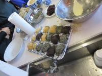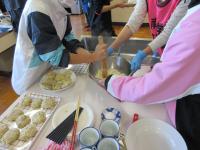それぞれの調理台にもどり、おはぎ作りにチャレンジ はじめは、炊いたもち米をつぶして丸める手つきがぎこちなかった子どもたちも、何個か作るうちにだんだん慣れてきて、綺麗な形のおはぎを素早く作ることができるようになりました