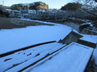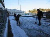 昇降口前は日が当たらないため、ガチガチに凍っていました 体育館裏の門からの階段も校舎裏の門からの階段もガチガチ