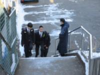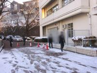 結局、昇降口前は雪が残っているところを通るように通路を作り、校舎裏の門からの階段は下りでかなり危険だったため封鎖。昇降口前&体育館裏に職員がつき、登校指導をしました
